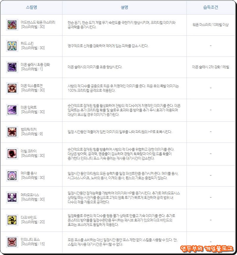 100 레벨 달성 후 드디어 데몬 슬래시 최종 강화를 마스터하게 되고, 이 스킬의 효과는 크리티컬 대미지와 공격력을 올려주는 혜자 스킬입니다.